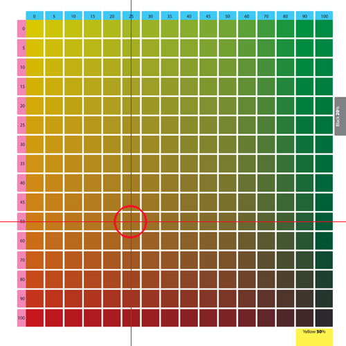 Σε αυτό το φύλλο, εντοπίζουμε το χρώμα που ζητάμε, διασταυρώνοντας τον κάθετο άξονα του Magenta στη γραμμή 50% με τον οριζόντιο άξονα του Cyan στην στήλη 25%.